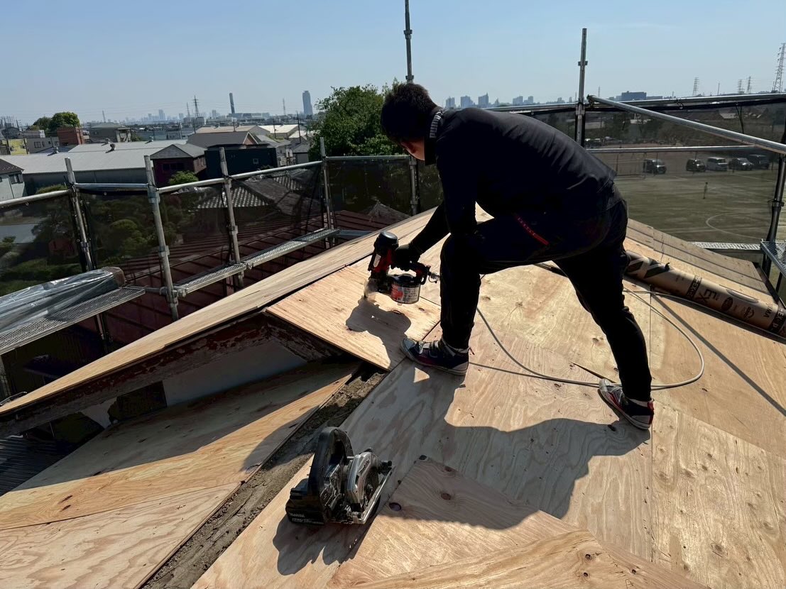 長年使ってきた屋根を撤去し、下地の補修から防水シートの施工まで丁寧に行いました。